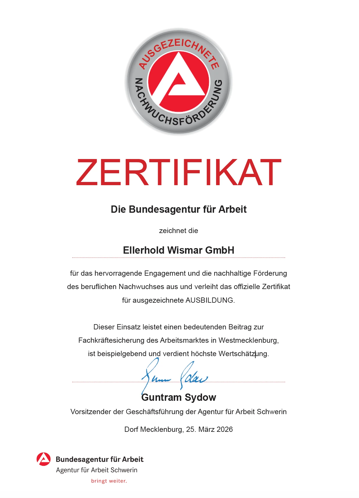 Die Bundesagentur für Arbeit in Schwerin zeichnete unsere Kolleginnen und Kollegen der Ellerhold Wismar GmbH für das hervorragende Engagement und die nachhaltige Förderung des beruflichen Nachwuchses aus und verlieh ihnen das offizielle Zertifikat für ausgezeichnete AUSBILDUNG.